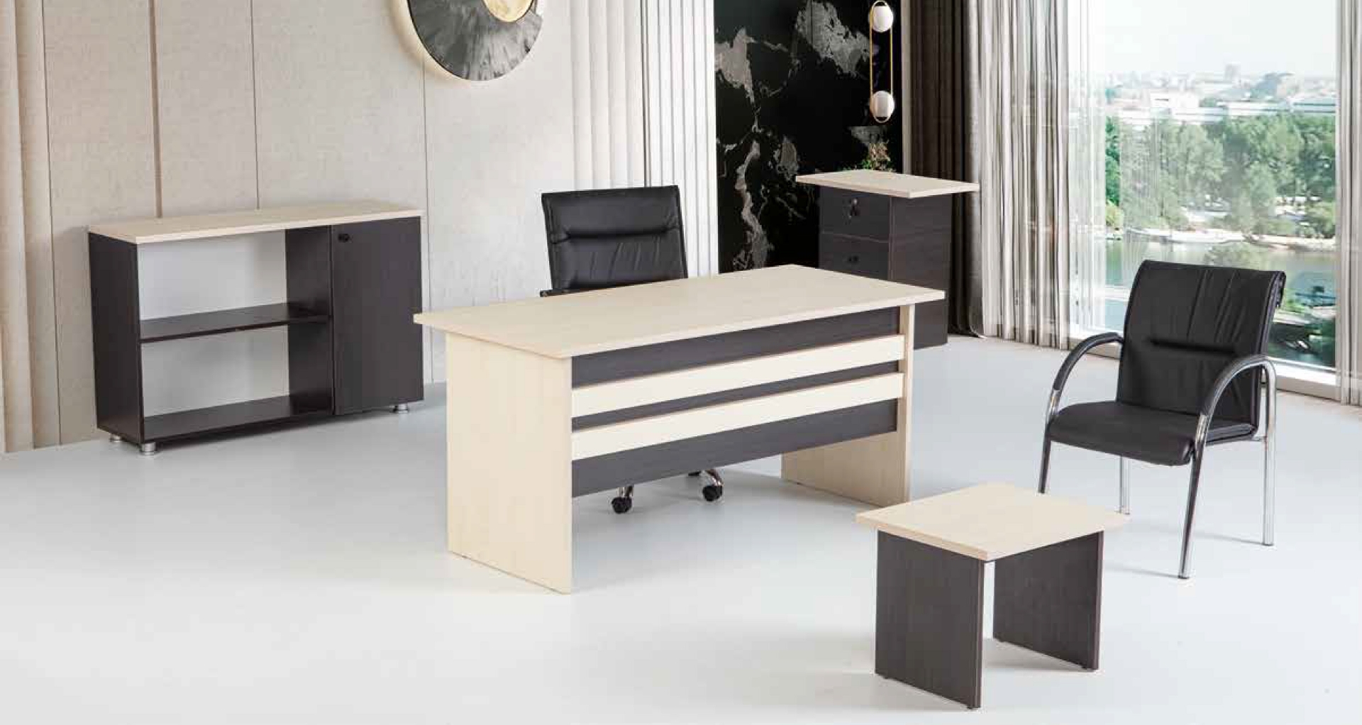 999 Patara Yönetici Takımları, Konya ofis mobilya imalatında Devbaks güvencesiyle tasarlanmış, estetik ve fonksiyonel bir ofis çözümüdür. 1600 mm genişlik, 750 mm yükseklik ve 700 mm derinlik ölçülerindeki masa, geniş ve rahat bir çalışma alanı sunar.
